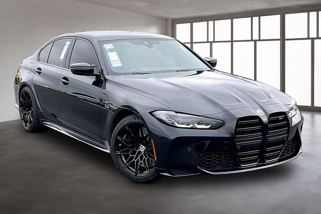 Black Sapphire Metallic 2023 BMW M3 Competition AWD 8-Speed Automatic Steptronic 3.0L I6 Turbocharged DOHC 24V LEV3-ULEV70 503hp competition package, 16 Speakers, 4-Wheel Disc Brakes, ABS brakes, Adaptive suspension, Air Conditioning, AM/FM radio: SiriusXM, Apple CarPlay & Android Auto Compatibility, Auto High-beam Headlights, Auto-dimming door mirrors, Auto-dimming Rear-View mirror, Automatic temperature control, BMW Assist eCall, BMW Curved Display, BMW TeleServices, Brake assist, Bumpers: body-color, Compass, Connected Package Pro, ConnectedDrive Services, Delay-off headlights, Driver door bin, Driver vanity mirror, Dual front impact airbags, Dual front side impact airbags, Electronic Stability Control, Emergency communication system: BMW Assist eCall, Enhanced USB & Bluetooth Plus Smartphone Integration, Extended Merino Leather Upholstery, Exterior Parking Camera Rear, Four wheel independent suspension, Front anti-roll bar, Front Bucket Seats, Front Center Armrest, Front dual zone A/C, Front reading lights, Fully automatic headlights, Garage door transmitter, harman/kardon Surround Sound System, harman/kardon® Speakers, Heated door mirrors, Heated Front Seats, Heated front seats, Illuminated entry, Knee airbag, Leather Shift Knob, Low tire pressure warning, Lumbar Support, M Sport Seats, Memory seat, Navigation System, Occupant sensing airbag, Outside temperature display, Overhead airbag, Panic alarm, Passenger door bin, Passenger vanity mirror, Power door mirrors, Power driver seat, Power Front Seats, Power passenger seat, Power steering, Power windows, Radio data system, Radio: AM/FM Audio System, Rain sensing wipers, Rear air conditioning, Rear anti-roll bar, Rear reading lights, Rear window defroster, Remote keyless entry, Security system, SiriusXM Satellite Radio w/1 Year Subscription, Speed control, Speed-sensing steering, Speed-Sensitive Wipers, Split folding rear seat, Spoiler, Sport steering wheel, Steering wheel mounted audio controls, Tachometer, Telescoping steering wheel, Tilt steering wheel, Traction control, Trip computer, Turn signal indicator mirrors, Variably intermittent wipers, Wheels: 19"x9.5" Fr.&20"x10.5"Rr. M Bi-color (1T8).