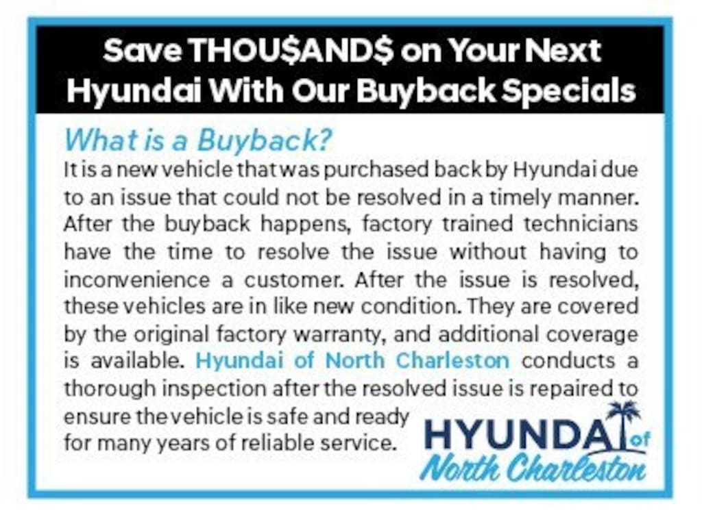 Disclaimers: The advertised price does not include sales tax, vehicle registration fees, finance charges, and any other fees required by law. All prices include all applicable factory rebates, factory discount, dealer discount and Trade Assist Rebate. Some discounts and rebates may require financing with Hyundai Motor Credit. Pricing for all Pre Owned vehicles include $1,000 Hyundai of Charleston Trade Cash; must trade a 2015 or newer vehicle with under 100,000 miles to qualify. Prices subject to change without notice based on Hyundai or dealer Incentives. However, there can be lag time between the sale of a vehicle and the update of the inventory. See dealer for full details. Limited availability while supplies last. Some exclusions may apply. See dealer for complete details. Please read Certified Pre Owned disclaimer on certified vehicles. 19/27 City/Highway MPG