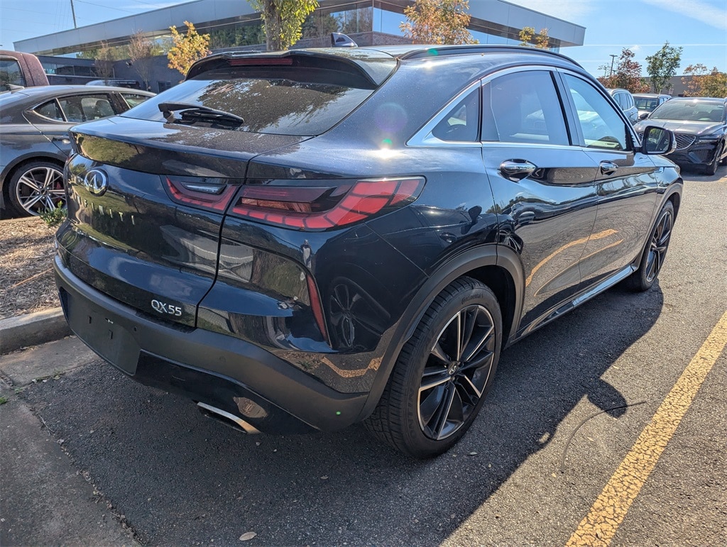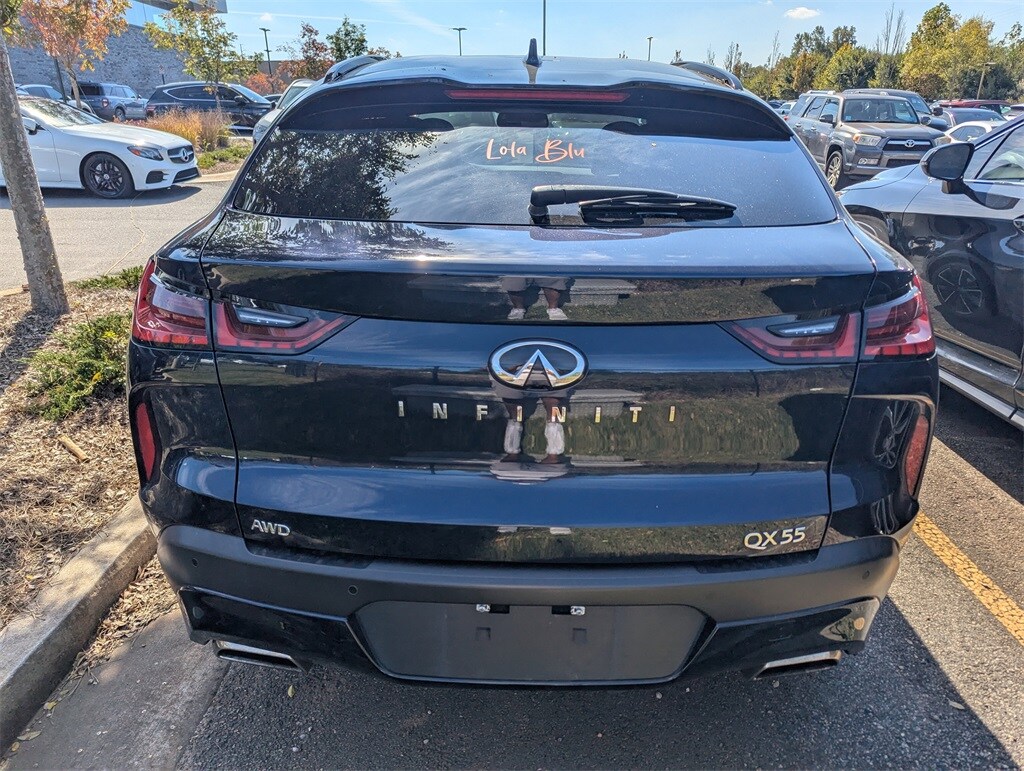 2022 INFINITI QX55 ESSENTIAL AWD CVT I4 16 Speakers, 4-Wheel Disc Brakes, 5.846 Axle Ratio, ABS brakes, Adaptive Front Lighting System, Air Conditioning, Alloy wheels, AM/FM radio: SiriusXM, Auto High-beam Headlights, Auto tilt-away steering wheel, Auto-dimming Rear-View mirror, Automatic temperature control, Blind Spot Intervention, Blind Spot Warning, Brake assist, Bumpers: body-color, Carpeted Floor Mats, CD player, Climate Controlled Front Bucket Seats, Cube Design LED Headlights, Delay-off headlights, Distance Control Assist, Driver door bin, Driver vanity mirror, Dual front impact airbags, Dual front side impact airbags, Electronic Stability Control, Emergency communication system: INFINITI InTouch, Four wheel independent suspension, Front anti-roll bar, Front Bucket Seats, Front Center Armrest, Front dual zone A/C, Front fog lights, Front reading lights, Fully automatic headlights, Garage door transmitter: HomeLink, Heated door mirrors, Heated front seats, Heated steering wheel, Illuminated entry, Intelligent Cruise Control, Knee airbag, Lane Departure Prevention, Leather Shift Knob, Leather-Appointed Seat Trim, Low tire pressure warning, Memory seat, Navigation system: INFINITI InTouch Navigation, Occupant sensing airbag, Outside temperature display, Overhead airbag, Overhead console, Panic alarm, Passenger door bin, Passenger vanity mirror, Power door mirrors, Power driver seat, Power Liftgate, Power moonroof, Power passenger seat, Power steering, Power windows, ProASSIST Package, Radio data system, Radio: Bose Performance Series Premium Audio, Rain sensing wipers, Rear anti-roll bar, Rear reading lights, Rear seat center armrest, Rear window defroster, Rear window wiper, Remote keyless entry, Security system, Speed control, Speed-sensing steering, Speed-Sensitive Wipers, Split folding rear seat, Spoiler, Steering wheel memory, Steering wheel mounted audio controls, Tachometer, Telescoping steering wheel, Tilt steering wheel, Traction control, Trip computer, Turn signal indicator mirrors, Variably intermittent wipers, Ventilated front seats, Wheels: 20" x 8.5" Machine Finish Aluminum Alloy.