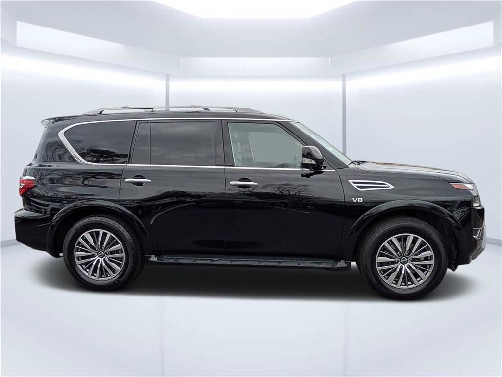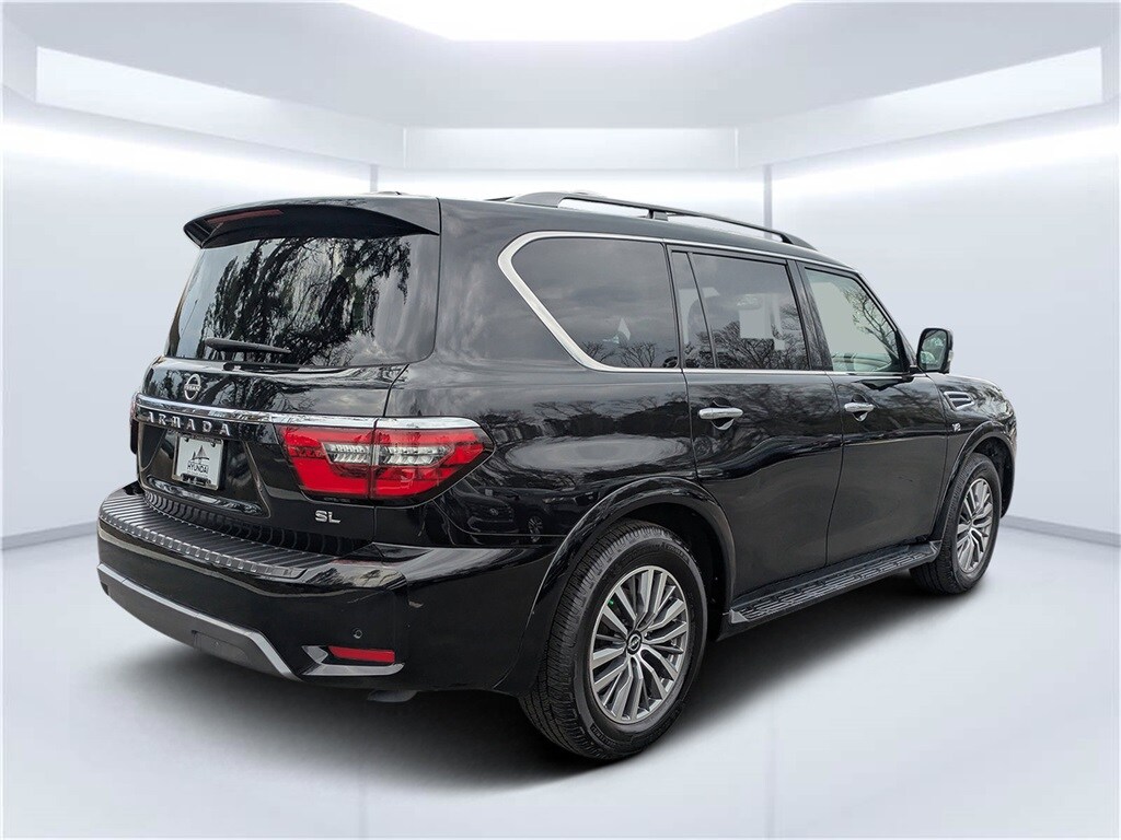 Super Black 2021 Nissan Armada SL RWD 7-Speed Automatic 5.6L V8 DOHC 32V LEV3-ULEV125 400hp 13 Speakers, 20" Painted Alloy Wheels, 2nd Row Captain's Chairs, 2nd Row Center Console w/Padded Armrest, 3rd Row Carpeted Floor Mats - Captain Seat, 3rd row seats: split-bench, 4-Wheel Disc Brakes, ABS brakes, Anti-whiplash front head restraints, Auto High-beam Headlights, Auto-leveling suspension, Brake assist, Captain's Chairs Package, Cross Bars, Delay-off headlights, Driver door bin, Dual front impact airbags, Dual front side impact airbags, Electronic Stability Control, Emergency communication system: NissanConnect Services, Exterior Parking Camera Rear, Four wheel independent suspension, Front anti-roll bar, Front Bucket Seats, Front Center Armrest, Front dual zone A/C, Front fog lights, Fully automatic headlights, Garage door transmitter: HomeLink, Heated Front Bucket Seats, Heated front seats, Illuminated entry, Illuminated Kick Plates, Leather Seat Trim, Leather Shift Knob, Low tire pressure warning, Navigation System, NissanConnect featuring Apple CarPlay and Android Auto, Occupant sensing airbag, Outside temperature display, Overhead airbag, Overhead console, Power Liftgate, Power moonroof, Power passenger seat, Radio: NissanConnect w/SiriusXM, Rear air conditioning, Rear anti-roll bar, Rear reading lights, Reclining 3rd row seat, Remote keyless entry, Speed-sensing steering, Split folding rear seat, Steering wheel memory, Steering wheel mounted audio controls, Telescoping steering wheel, Tilt steering wheel, Traction control, Turn signal indicator mirrors.